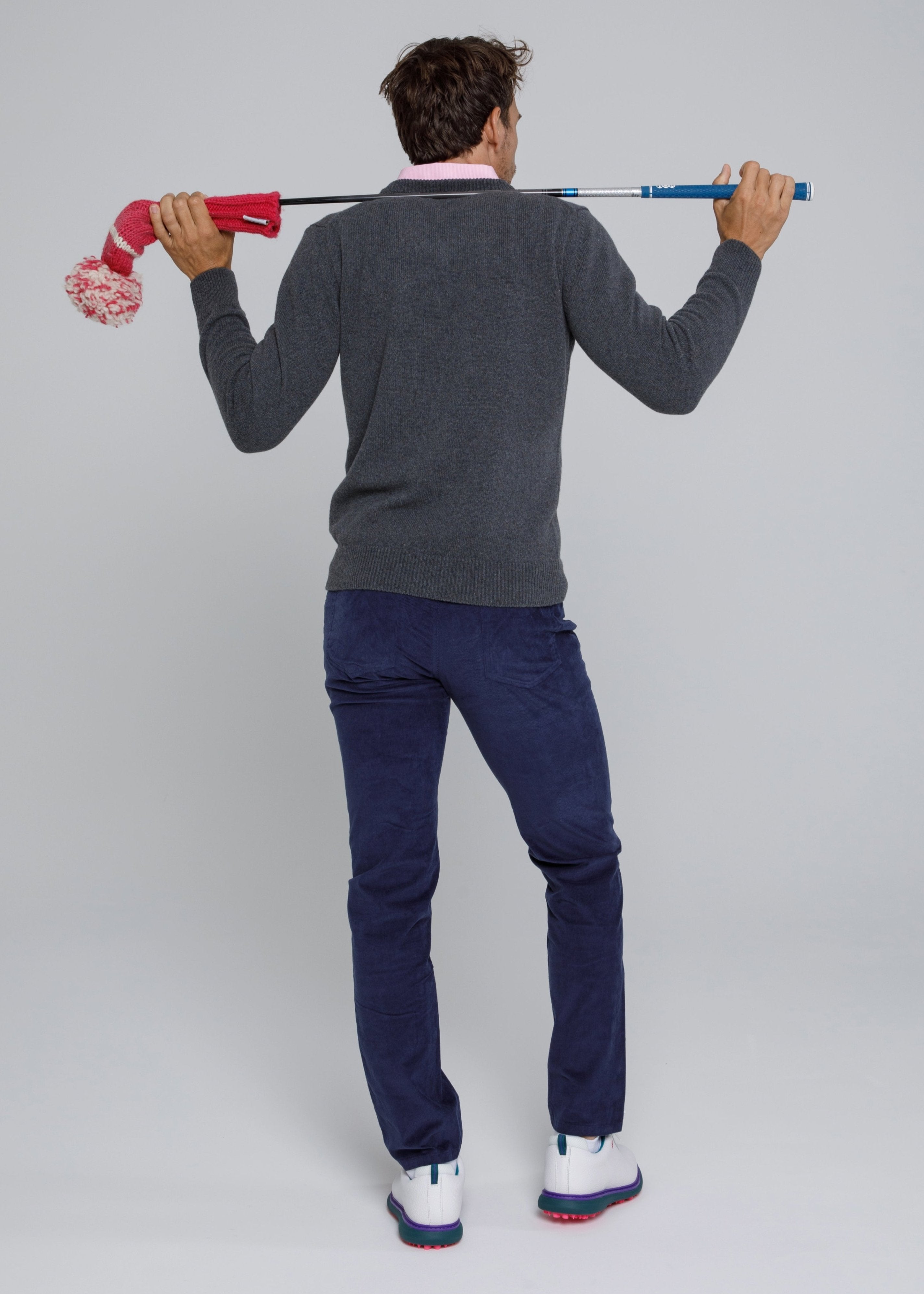 It has been said that our cashmere sweaters are "soft yet formidable". If you are looking for the perfect gray sweater for shoulder-season golf or just to take the edge off a cool Fall evening, this 100% Italian cashmere v-neck is the sweater for you.